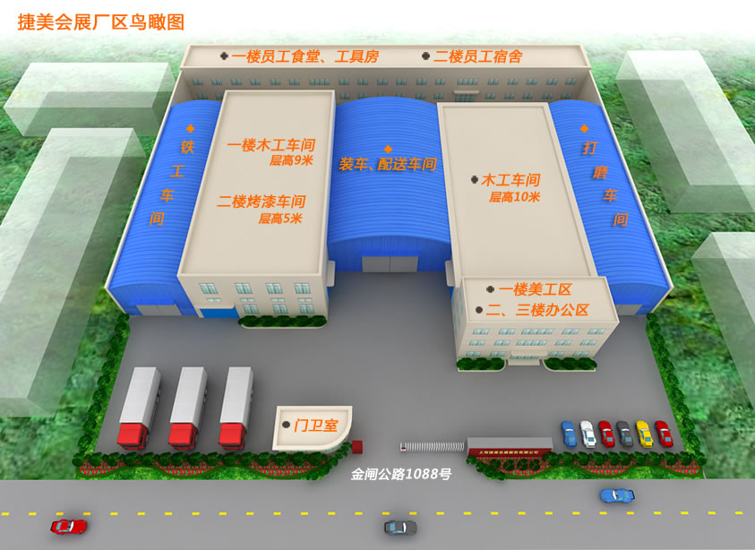 捷美工廠位于上海市奉賢區(qū)金閘路1088號,位于上海國家會(huì)展中心及上海新國際博覽中心中間位置距各大型展館僅需45分鐘車程.工廠占地8000平米,整體區(qū)分為辦公區(qū);展覽制作車間;道具制作車間;鐵藝車間;美 工車間;倉儲(chǔ)庫房;宿舍樓以及食堂.